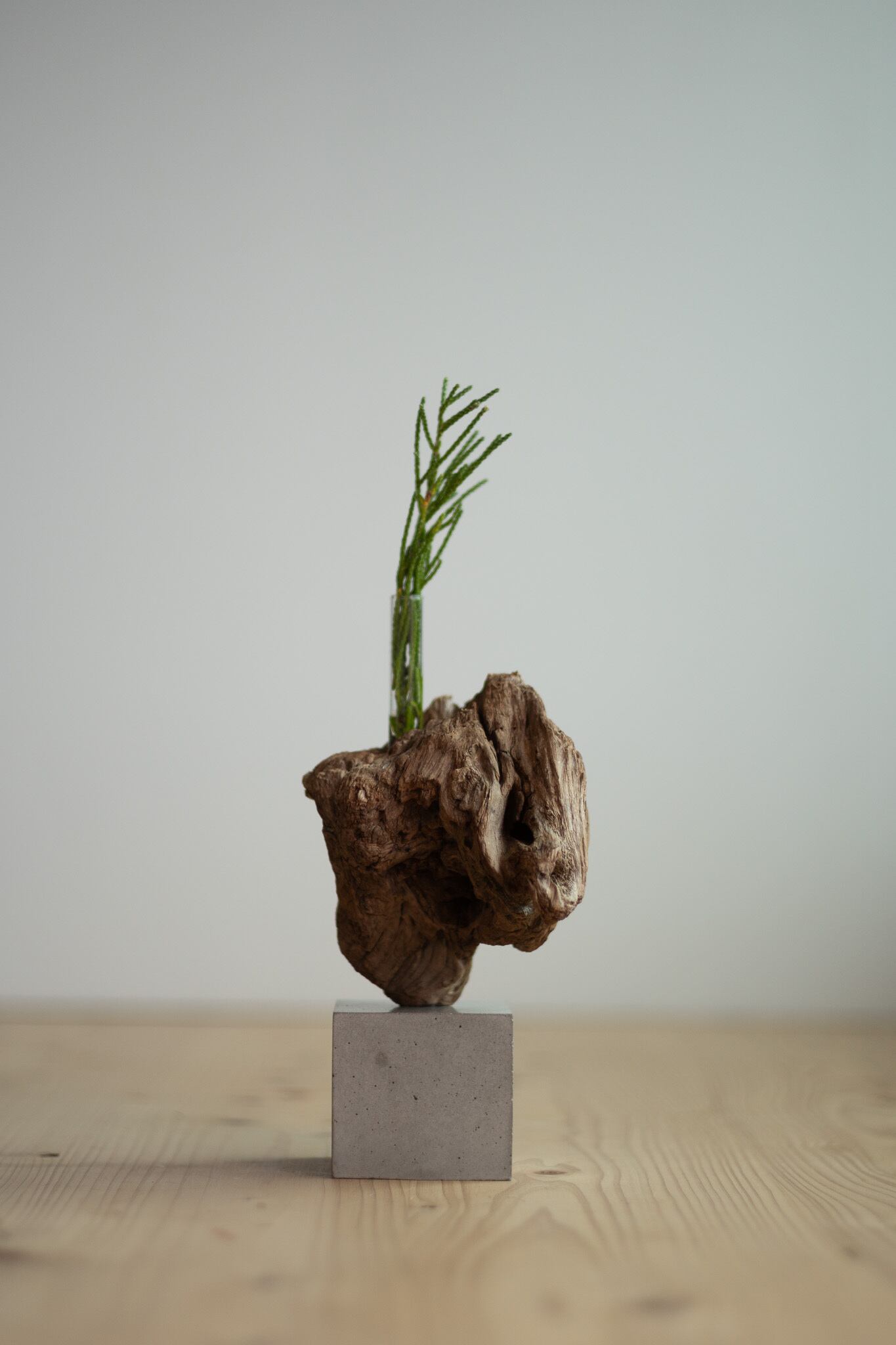 セメントに絶妙なバランスで流木が固定しています。