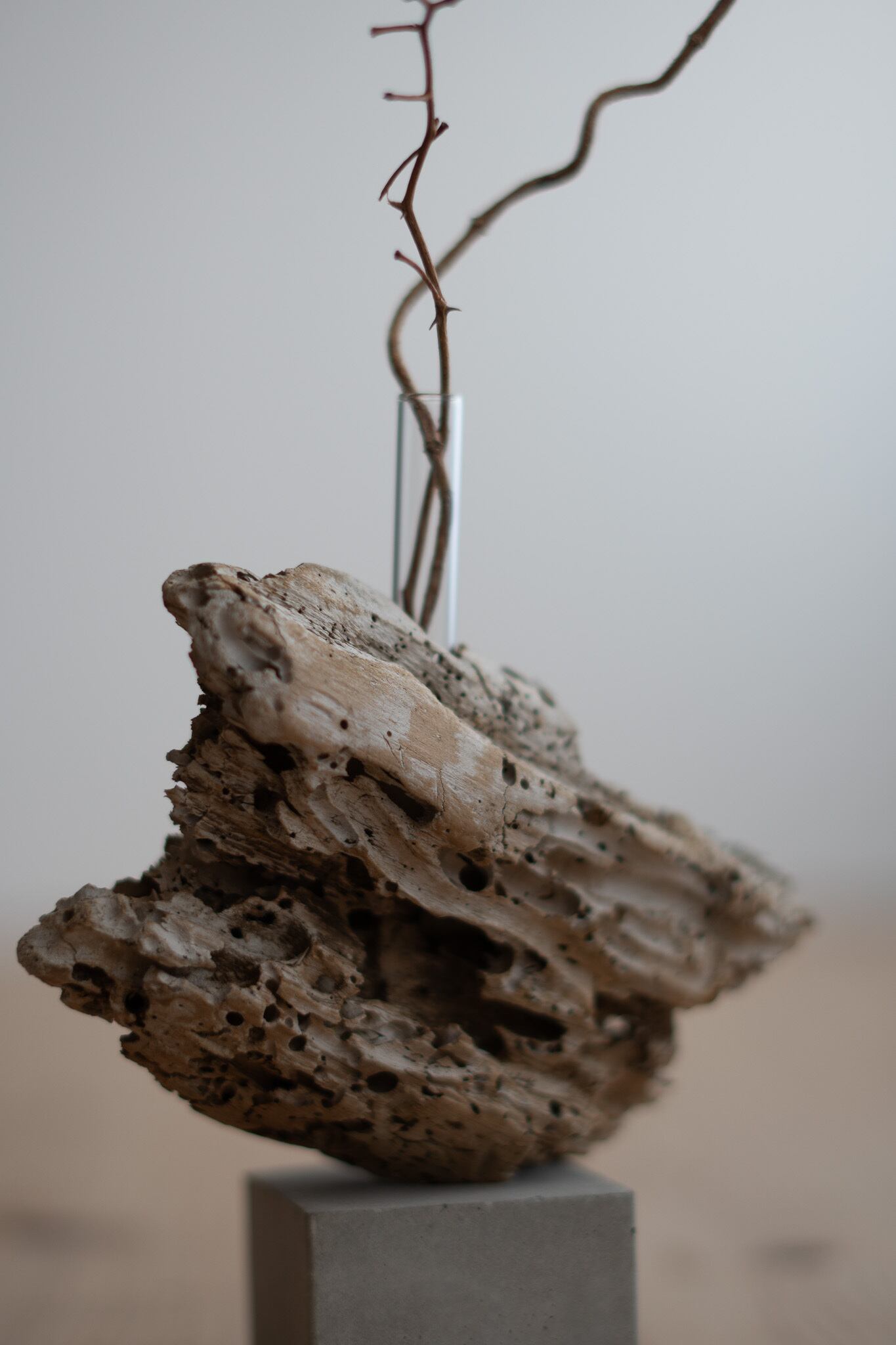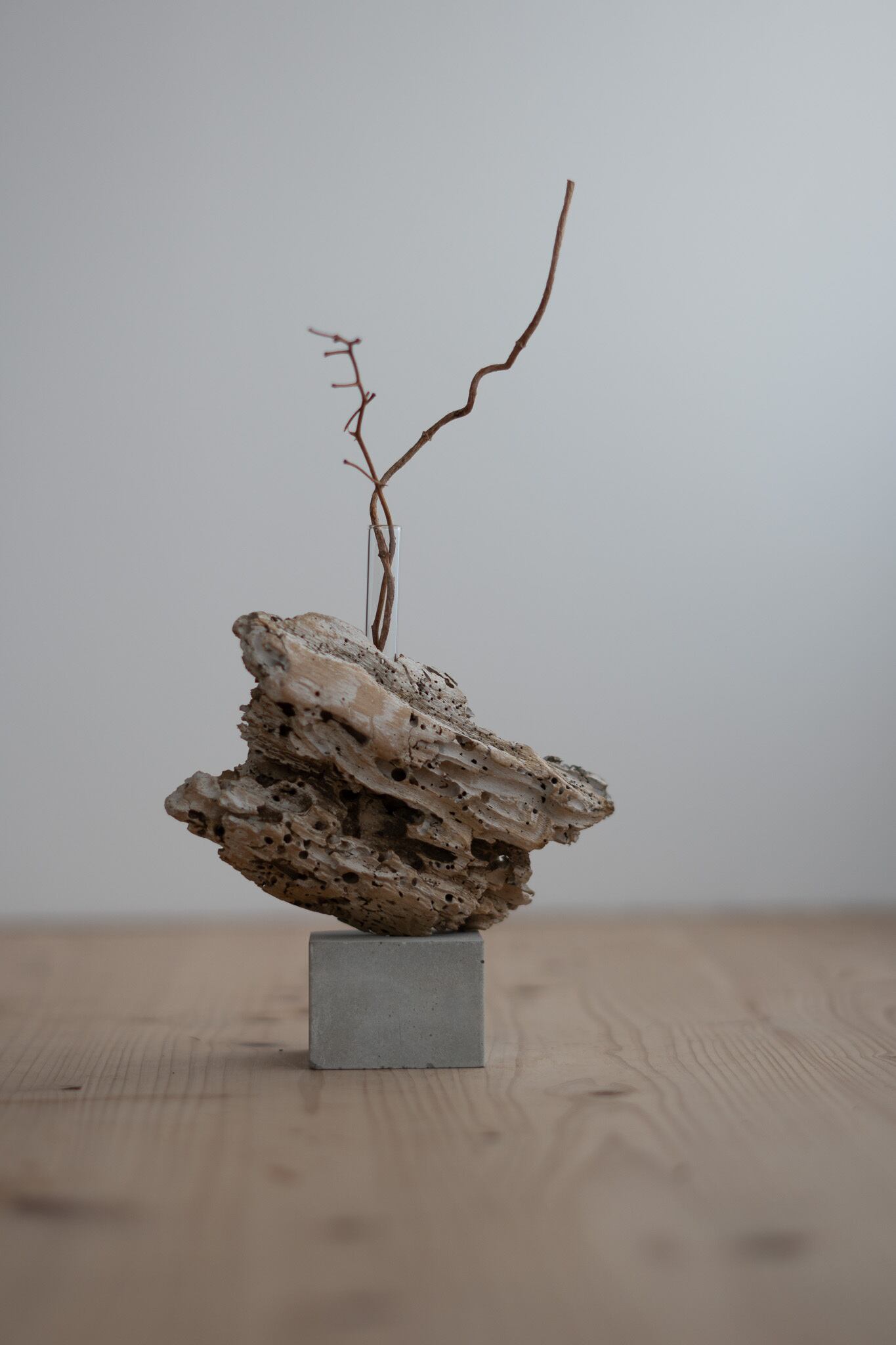 セメントに絶妙なバランスで流木が固定しています。